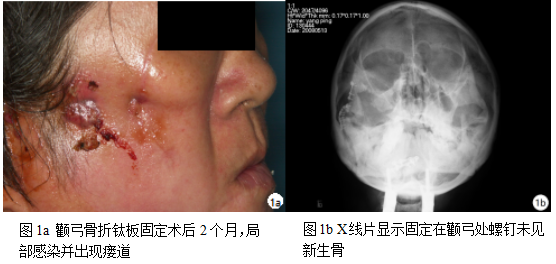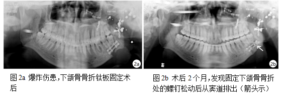 口腔頜面外傷近幾年呈逐漸上升趨勢,在頜面外傷中除可能發(fā)生骨折、骨質(zhì)裸露或缺損外,其周圍軟組織也會有不同程度的水腫和損傷。尤其是爆炸傷患者,其軟組織創(chuàng)緣常有燒灼及震蕩傷,易發(fā)生局部軟組織的壞死[6]。在本組20例頜骨骨折患者中,多為粉碎性骨折,骨段的復位和固定有一定困難,且往往需要兩塊以上的鈦板固定在很狹窄的骨段上,以維持其穩(wěn)定性。加之相應部位的軟組織有不同程度的壞死和損傷,血供較差,這些患者多在骨折復位固定術1~2個月發(fā)生局部疼痛,粘膜或皮膚出現(xiàn)瘺道,且時常有分泌物流出(圖1)。沿竇道可探到鈦板或螺釘,本組患者中5例訴有松動螺釘從瘺道排出(圖2 )。這可能與鈦板固定區(qū)骨質(zhì)不健康導致局部感染,發(fā)生排斥反應,或與螺釘所在區(qū)域骨皮質(zhì)較少,螺釘固定不牢有關。當皮膚或粘膜紅腫并有瘺道?,甚至有螺釘從竇道排出,此時局部換藥或使用抗生素雖可減輕患者疼痛和不適感,但不能解決根本問題。應在病情穩(wěn)定時及時取出鈦板,并對感染的軟硬組織進行處理。