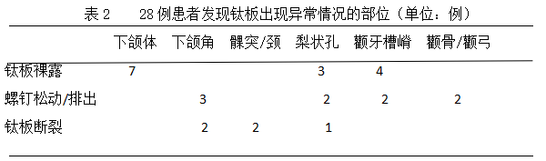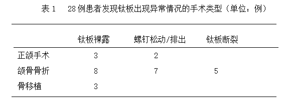 方法:對28例鈦板裸露、螺釘松動或脫落及鈦板斷裂患者的手術類型、手術時的情況,鈦板出現(xiàn)異常情況的時間等進行了回顧性分析與研究。