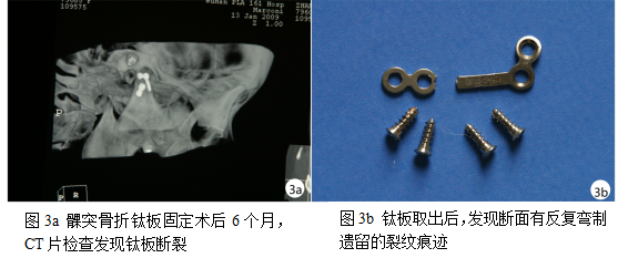 由于頜骨的特殊結構,加之頜面外傷和正頜術后頜骨的移動,在進行骨段固定時,使用的鈦板常需塑型,以便被動貼合于骨面上[3]。?在操作過程中若對上下頜骨形態(tài)和弧度不甚了解而反復彎制鈦板,容易造成鈦板微裂或金屬疲勞?,加之這些鈦板常固定于應力集中區(qū),隨著頻繁的張閉口運動及頜骨受力,容易發(fā)生鈦板斷裂,本組鈦板斷裂的患者中有4例是這種情況(圖3)。另外,在許多口腔頜面外科手術中,需通過口內(nèi)途徑固定鈦板,手術視野暴露有時不充分,器械不能在正常角度下使用,尤其時在鉆孔時,鉆頭反復摩擦鈦板孔邊緣,使其變薄、變窄,鈦板的強度明顯減弱,也是手術后造成鈦板斷裂的原因之一,本組鈦板斷裂的患者中有1例屬這種情況。鈦板斷裂后,患者僅有局部不適感,均在術后復診拍攝X線片時發(fā)現(xiàn)。發(fā)現(xiàn)鈦板斷裂后,應囑患者減少張閉口運動,以防鐵板斷段刺傷周圍組織,并應盡早取出鐵板。