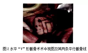 經(jīng)鼻腔插管全麻起效后,于上頜前庭溝及耳屏前以0.5%利多卡因混合腎上腺素(1 :200 000)行局部浸潤。于尖牙窩至第一磨牙區(qū)行口內(nèi)黏骨膜切口,暴露上頜骨前后份、顴骨體、顴弓前三分之二及下外側(cè)緣。注意保護眶下神經(jīng)及附著于顴弓上的咬肌。深拉鉤充分暴露視野。水平“V”形截骨術(shù)的手術(shù)步驟與目前流行的“L”形截骨術(shù)類似,區(qū)別在于水平“V”形截骨術(shù)有兩條平行截骨線,兩條平行線相匯成水平“V”形。