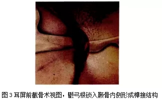 然后,于耳屏前做深及顳筋膜的小切口。鈍分離暴露顴弓根,于關(guān)節(jié)結(jié)節(jié)前行骨切開術(shù)。將游離的顴弓根向內(nèi)側(cè)、上方推移,鎖入離斷的顴突及顳之間,似剛性骨間固定的榫接結(jié)構(gòu)(圖1 ,3)。