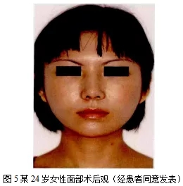 患者女,24歲,雙側(cè)顴骨突出,面形為“菱形”。經(jīng)術(shù)前嚴格檢查、設(shè)計、評估后,于我科全麻下行水平“V”形截骨內(nèi)推術(shù),對顴骨及顴弓重新定位 、固定。術(shù)后一年復(fù)查,效果滿意,面部的線條柔和,面形明顯改善(圖4,5)。