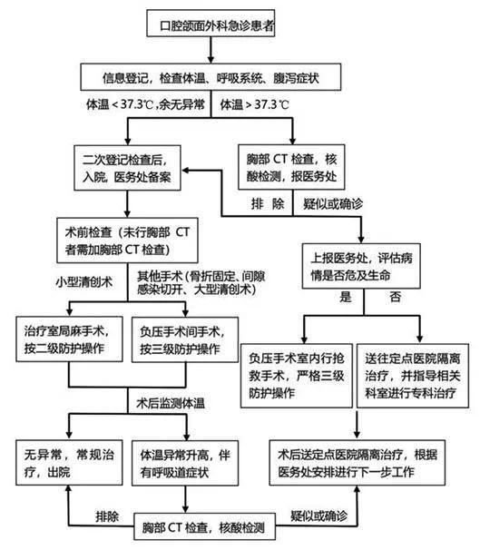 COVID-19病毒是一種新型病毒,對其生物學(xué)行為和由其導(dǎo)致的肺炎的治療,目前仍處于研究探索期,尚無明確的特效治療藥物。因此,對于口腔頜面外科急診治療而言,必須從源頭上做好防控,才能減少由醫(yī)療活動造成感染和疫情擴(kuò)散的風(fēng)險[10-11]。我院高度重視疫情防控工作,于1月20日成立了院長擔(dān)任組長的新冠肺炎防控工作領(lǐng)導(dǎo)小組,由醫(yī)務(wù)處牽頭,組織口腔頜面外科、麻醉科、手術(shù)室、護(hù)理部、感控科、設(shè)備器材科共同討論,制訂了口腔頜面外科急診患者收治醫(yī)療工作流程(圖1)。主要內(nèi)容包括:①明確需住院治療的急診患者僅包括嚴(yán)重頜面部間隙感染患者、頜面部挫裂傷患者,如不及時治療會危及生命,或者導(dǎo)致畸形、嚴(yán)重功能障礙且后期治療難度較大的頜骨骨折患者。②急診患者需先前往口腔醫(yī)院急診科,監(jiān)測患者及陪人體溫并填寫疫區(qū)核查登記表,患者需確認(rèn)所填信息的真實性,存入病歷。③如果體溫>37.3℃,需前往指定醫(yī)院(第四軍醫(yī)大學(xué)唐都醫(yī)院)發(fā)熱門診進(jìn)行篩查,行胸部CT檢查與核酸檢測,排除新型冠狀病毒感染后可繼續(xù)就診;④體溫正常且無疫區(qū)接觸史的患者方可進(jìn)入住院部,只允許1名固定陪人留院,住院部入口、病區(qū)入口設(shè)置兩級核查崗位,核查體溫及疫區(qū)核查登記表,符合要求方可進(jìn)入病區(qū),住院病房為單人單間。⑤入院后盡快完成術(shù)前準(zhǔn)備,患者均需要有術(shù)前胸部CT檢查結(jié)果方可安排手術(shù);簡單清創(chuàng)手術(shù)可以在病房治療室完成,實施手術(shù)的醫(yī)護(hù)人員按二級防護(hù)級別操作;其余手術(shù)在負(fù)壓手術(shù)間完成,手術(shù)醫(yī)師、護(hù)士與麻醉師按三級防護(hù)級別進(jìn)行操作。全麻患者蘇醒后送至病房ICU進(jìn)行6~8 h隔離監(jiān)護(hù),情況平穩(wěn)后轉(zhuǎn)出至普通病房,監(jiān)護(hù)室護(hù)士需穿防護(hù)隔離衣。傷口換藥均在病房內(nèi)進(jìn)行,醫(yī)生按二級防護(hù)級別操作。⑥鼓勵患者術(shù)后在房間內(nèi)進(jìn)行康復(fù)運動,對患者及家屬進(jìn)行新型冠狀病毒的相關(guān)知識宣教,指導(dǎo)其進(jìn)行手衛(wèi)生。⑦術(shù)后評估患者情況,病情允許時盡早安排出院,縮短在院時間。