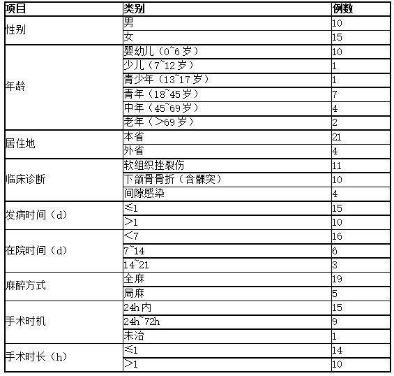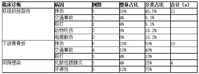 25例急診患者的病種主要為下頜骨骨折(含髁突骨折)、軟組織挫裂傷、口腔頜面部間隙感染。其中,軟組織挫裂傷11例,占44%;下頜骨骨折10例,占0%;間隙感染4例,占16%。外傷患者中,意外摔倒致傷11例,交通事故致傷5例,暴力傷害致傷2例,操作電鋸意外致傷2例,動物咬傷2例;間隙感染患者中,牙源性感染3例,化膿性腮腺炎感染擴(kuò)散1例(表2)。