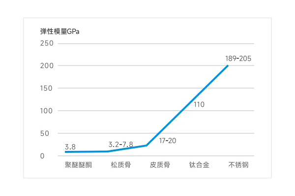 PEEK的彈性模量與人體骨非常接近,骨骼所受的應(yīng)力并不完全由植入體承擔(dān),因此不存在所謂的應(yīng)力屏蔽現(xiàn)象,從而使植入物周圍的骨骼更健康。